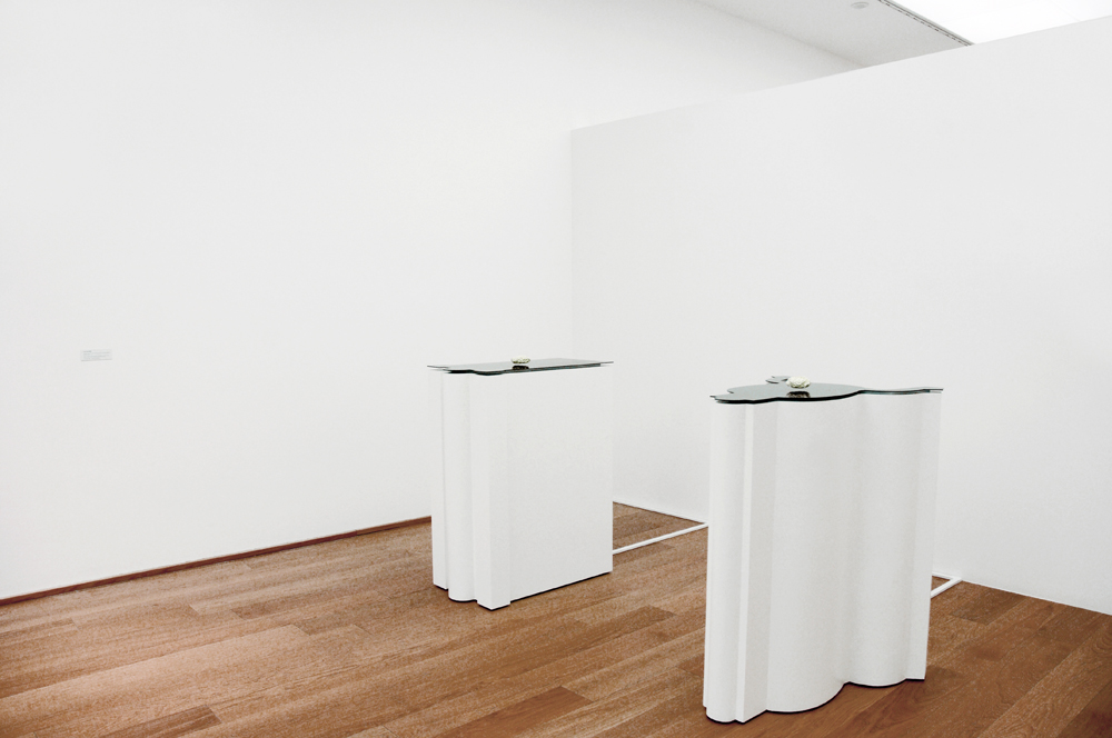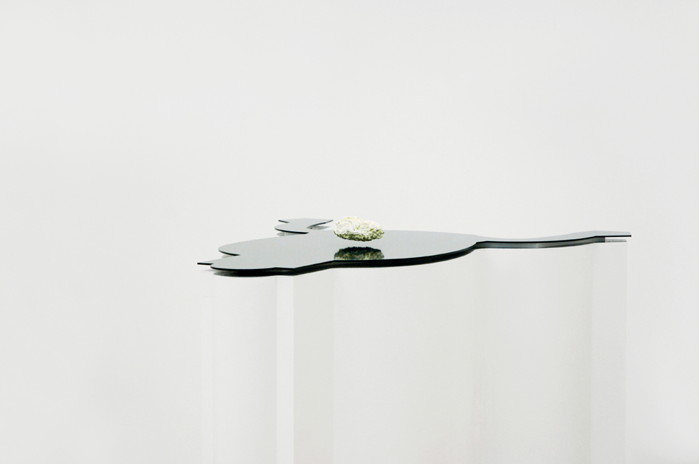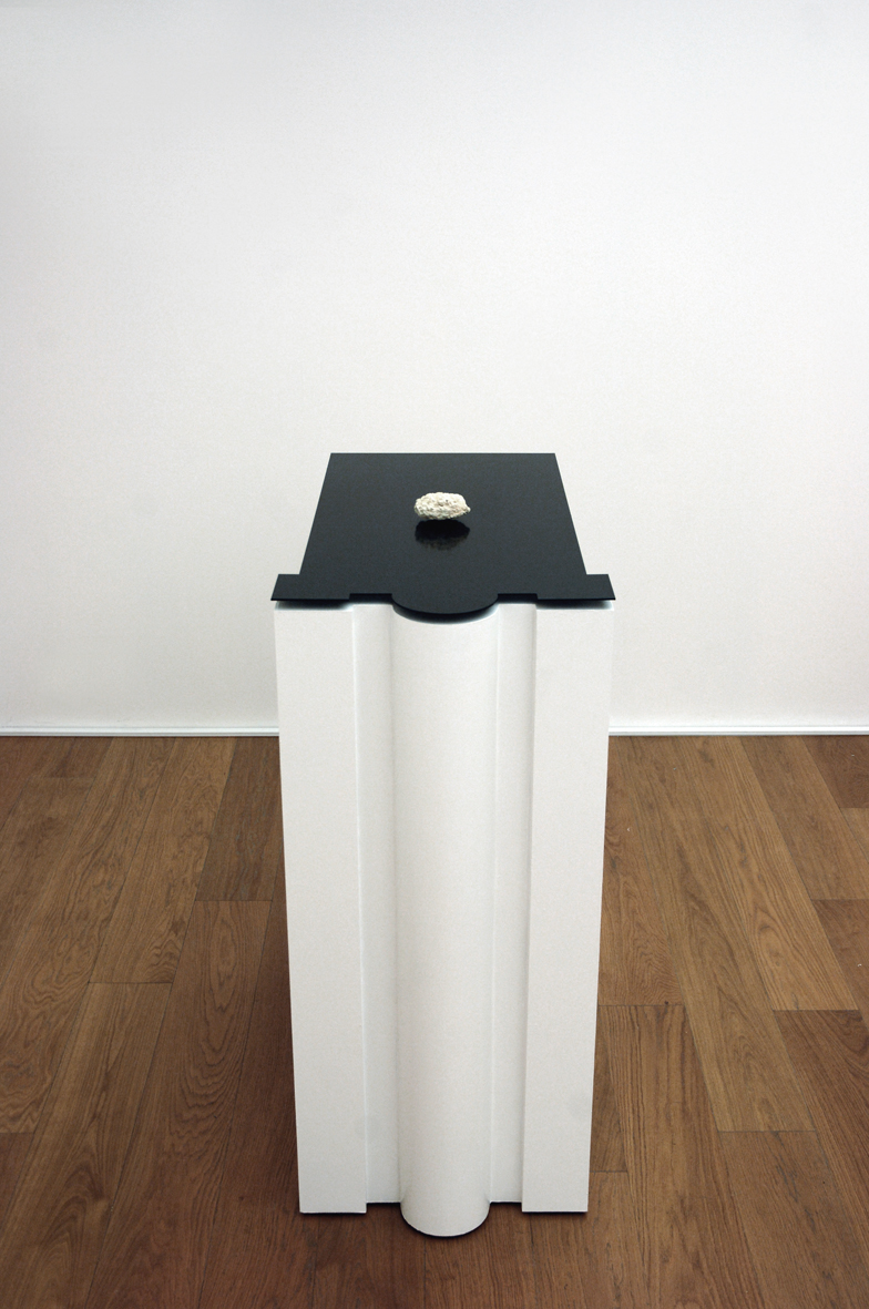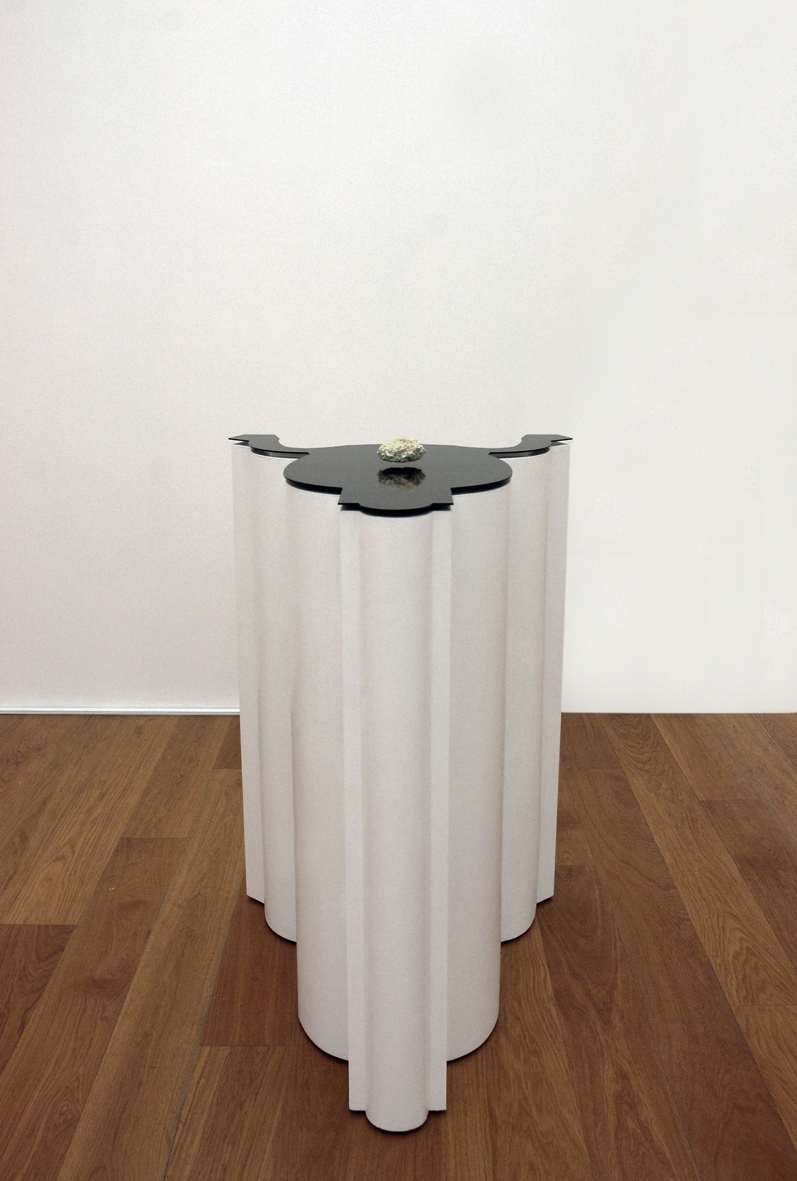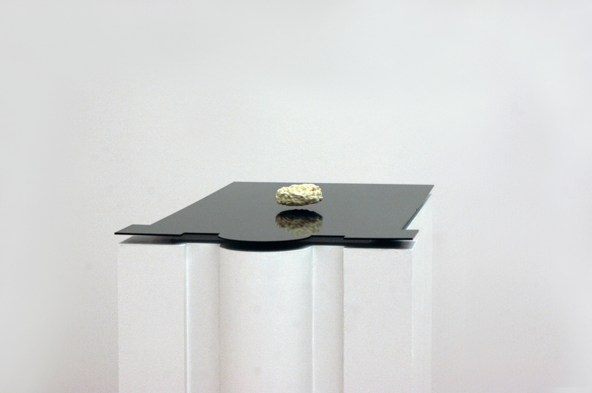 [Electromagnetic fields, sponge, inox 204, phosphor,linoleum, wood pedestal, 130x60x80 cm]